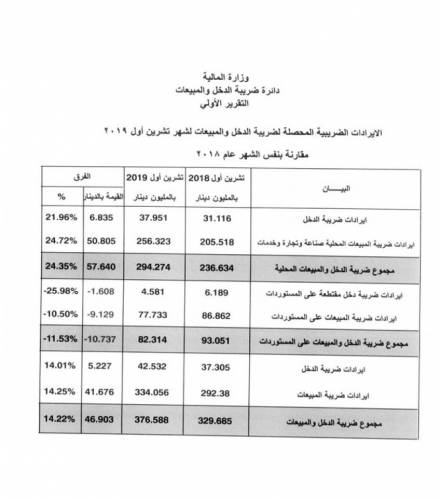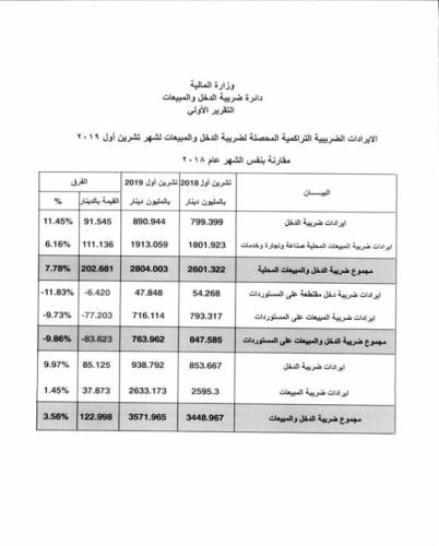 وتأتي هذه الزيادة في التحصيلات الضريبية للعشرة شهور الاولى من عام 2019 نتيجة ارتفاع كل من تحصيلات ضريبة الدخل وتحصيلات ضريبة المبيعات حيث ارتفعت تحصيلات الدخل الى (938.8) مليون دينار في حين كانت خلال نفس الفترة من عام 2018 ما مقداره (853.7) مليون دينار بزيادة مقدارها (85.1) مليون دينار وبنسبة زيادة (10%) اما ضريبة المبيعات للعشرة شهور الاولى فقد ارتفعت الى (2633.2) مليون دينار في حين كانت خلال نفس الفترة من عام 2018 ما مقداره (2595.3) مليون دينار بزيادة مقدارها (37.9) مليون دينار ونسبة ارتفاع (1.5%).