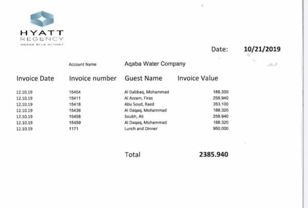 تناقلت منصات التواصل الاجتماعي ما قيل انها فاتورة غداء وعشاء لمدة يوم واحد في أحد فنادق العقبة لوزير المياه الحالي المهندس رائد أبو السعود ومرافقين له من الوزارة بقيمة مالية بلغت 2385 دينار أردني !