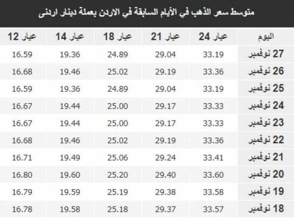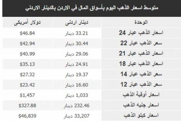 وتحتوي أيضا علي مخطط بمعدل الارتفاع والانخفاض في اسعار الذهب اليوم في الاردن في الأيام السابقة في السوق الأردني.
