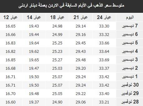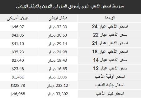 ويحتوي أيضا علي مخطط بمعدل الارتفاع والانخفاض في اسعار الذهب اليوم في الاردن في الأيام السابقة في السوق الأردني.