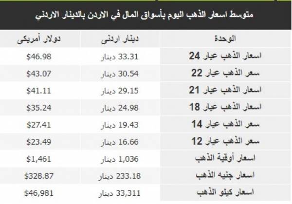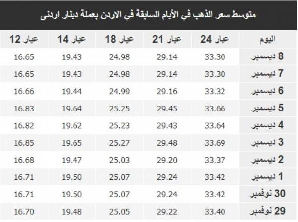 وتحتوي أيضا علي مخطط بمعدل الارتفاع والانخفاض في اسعار الذهب اليوم في الاردن في الأيام السابقة في السوق الأردني.