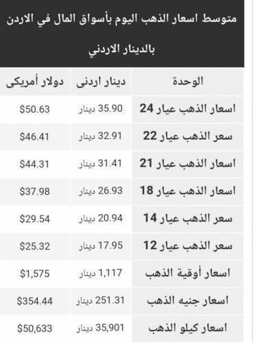 ويحتوي أيضا علي مخطط بمعدل الارتفاع والانخفاض في اسعار الذهب اليوم في الاردن في الأيام السابقة في السوق الأردني.