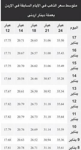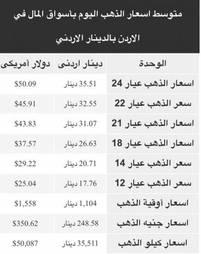ويحتوي أيضا علي مخطط بمعدل الارتفاع والانخفاض في اسعار الذهب اليوم في الاردن في الأيام السابقة في السوق الأردني.