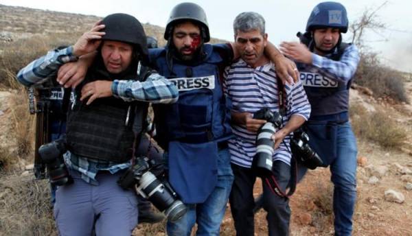 قال الصحفي الفلسطيني معاذ عمارنة : ان الرصاصة التي اطلقها جنود الاحتلال الاسرائيلي، "اقتلعت عيني، مازالت في رأسي ومستقرة عند جدار الدماغ"