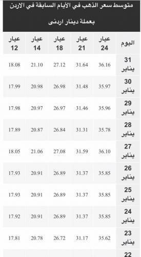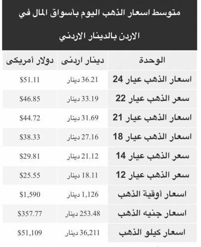 ويحتوي أيضا علي مخطط بمعدل الارتفاع والانخفاض في اسعار الذهب اليوم في الاردن في الأيام السابقة في السوق الأردني.