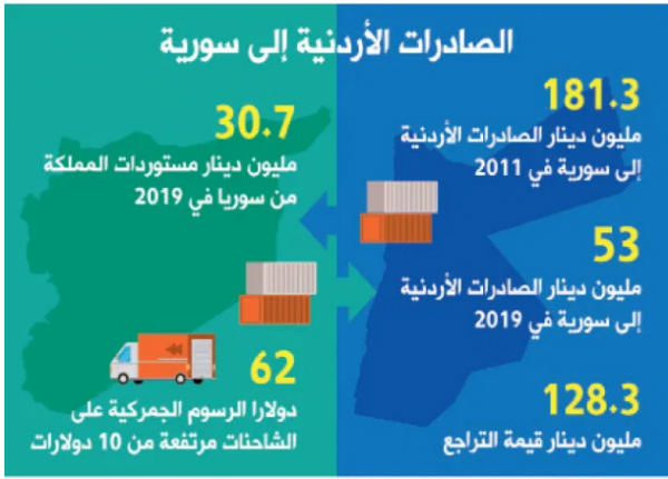 وتظهر الإحصائيات أن الأردن صدر إلى سورية العام 2011 بقيمة 181.3 مليون دينار، إلا أن الأحداث التي شهدتها وما رافقها من إغلاق للحدود البرية، أدت إلى هبوط حاد بقيمة التصدير إلى 53 مليون دينار العام 2019، لتسجل تراجعاً بمقدار 128.3 مليون دينار.