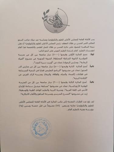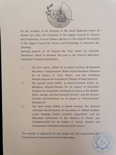 جفرا نيوز - يسر الأمانة العامة للمجلس الأعلى للعلوم والتكنولوجيا وبمناسبة عيد ميلاد صاحب السمو الملكي الامير الحسن بن طلال المعظم -رئيس المجلس الاعلى للعلوم والتكنولوجيا- أن تعلن نتيجة المنافسة للحصول على جائزة الحسن بن طلال للتميّز العلمي والمُخصصة هذا العام لمؤسسات التعليم العام باستثناء التعليم المهني على النحو التالي: