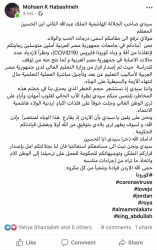 طلبة أردنيون في الجامعات المصرية يناشدون جلالة الملك لانقاذهم بعد انتشار "كورونا" في جمهورية مصر العربية