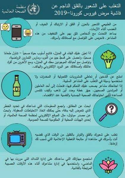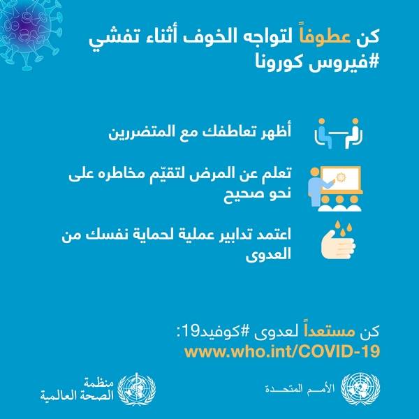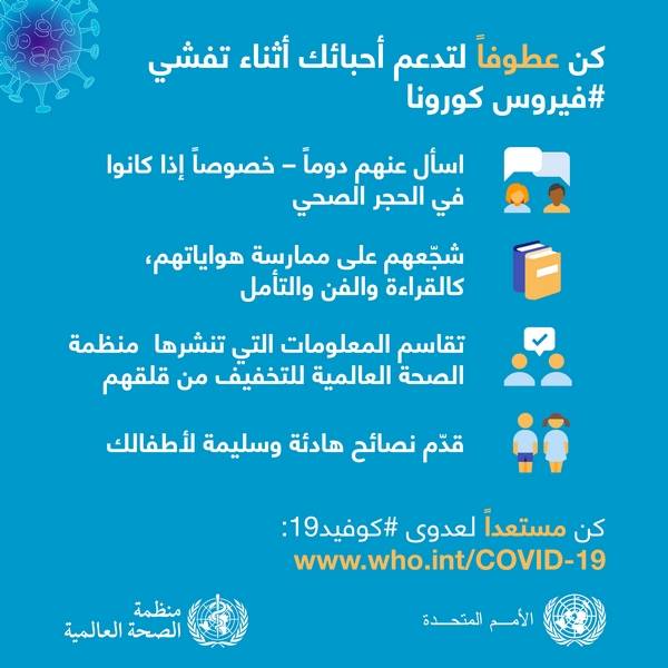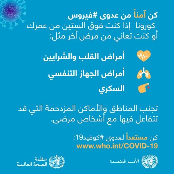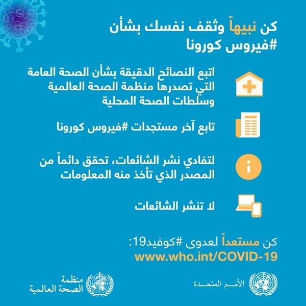 جفرا نيوز - احرص على متابعة آخر المستجدات عن فاشية مرض كوفيد-19، على الموقع الإلكتروني لمنظمة الصحة العالمية ومن خلال سلطات الصحة العامة المحلية والوطنية. وفي حين لا تزال عدوى كوفيد-19 متفشية في الصين بشكل أساسي، فهناك بعض بؤر التفشي في بلدان أخرى. ومعظم الأفراد الذين يصابون بالعدوى يشعرون بأعراض خفيفة ويتعافون، ولكن الأعراض قد تظهر بشكل أكثر حدة لدى غيرهم. احرص على العناية بصحتك وحماية الآخرين بواسطة التدابير التالية: