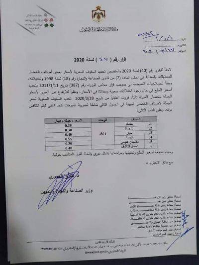 وكان وزير الصناعة حدد اسعار الخضار للمستهلك الاسبوع الماضي واكد في تصريحات صحافية اليوم ان الوزارة لن تتهاون مع المخالفين وقد اغلقت 100 محل تجاري مخالف .