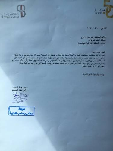 شركة بسطامي وصاحب التجارية تقدم مبلغ 100ألف دينار أردني دعما لصندوق "همة وطن"