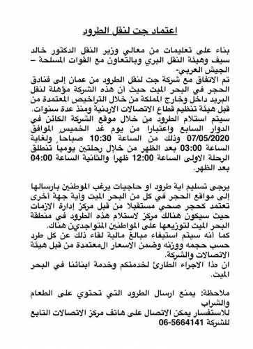 جفرا نيوز -اعتمدت وزارة النقل وهيئة النقل البري والقوات المسلحة شركة جت لنقل الطرود من عمان الى فنادق الحجر في منطقة البحر الميت.
