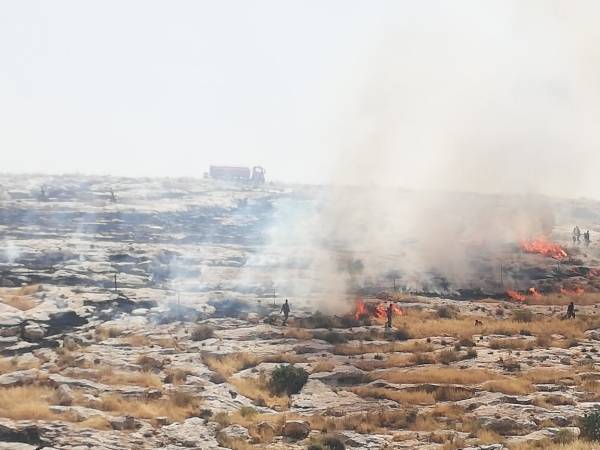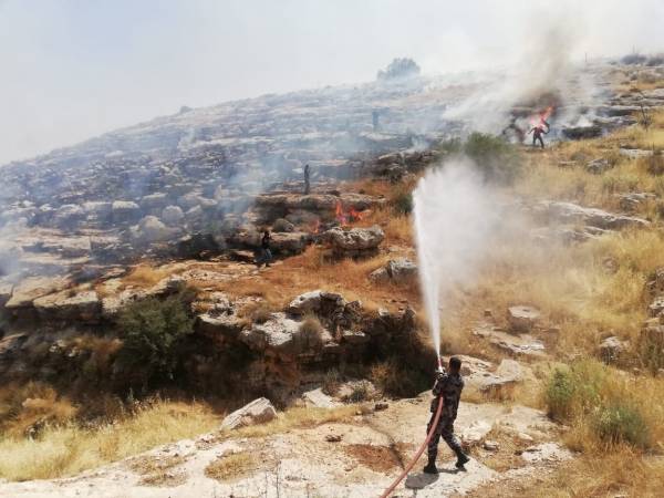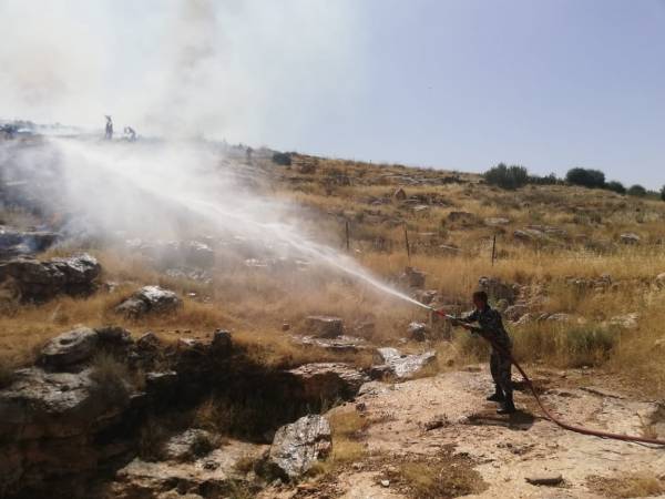 في الصورة نشامى الدفاع المدني يساندهم نشامى الدرك يتعاملون مع حرائق لحشائش جافة واشجار في منطقة جبل بني حميدة