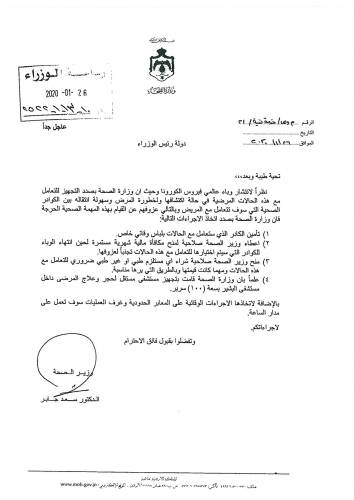حيث تم نشر الكتاب، الذي رفعه وزير الصحة إلى رئيس الوزراء بتاريخ 26 كانون الثاني 2020 وكتاب رد وموافقة رئيس الوزراء بتاريخ 2 /2/ 2020 على منح مكافأة مالية شهرية مستمرة للكوادر الصحية لحين انتهاء الوباء