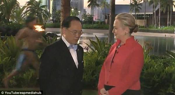 جفرا نيوز - جفرانيوز- - خلال مرافقتها للرئيس الأمريكي باراك أوباما لحضور قمة منتدى دول آسيا-المحيط الهادئ في مدينة هونولولو عاصمة ولاية هاواي الأمريكية، تفاجأت وزيرة الخارجية الأمريكية هيلاري كلينتون برجل شبه عاري يجري خلفها ممسكا بشعلة مضيئة في يده، في الوقت الذي كانت تلتقط فيه الصور التذكارية مع الرئيس التنفيذي لمنطقة هونغ كونغ دونالد تسانغ .