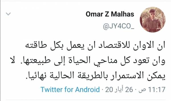 وقال ملحس بتغريدة له عبر تويتر: آن الاوان للاقتصاد ان يعمل بكل طاقته وان تعود كل مناحي الحياة إلى طبيعتها.