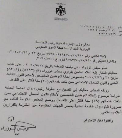 ووجه الرزاز في كتابه المصري إلى ضرورة التنسيق مع رئيس ديوان الخدمة المدنية لدراسة (احالة الموظفين الخاضعين لأحكام قانون الضمان الاجتماعي ممن بلغت خدماتهم 28 سنة فأكثر إلى التقاعد) ووضع المعايير اللازمة لذلك.