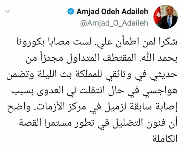 نفى وزير الدولة لشؤون الإعلام والاتصال الناطق الرسمي باسم الحكومة أمجد العضايلة ما اشيع حول إصابته بفيروس كورونا المستجد.
