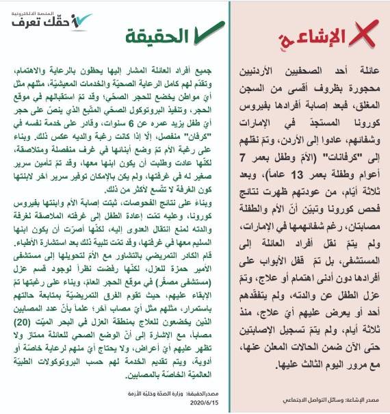 جفرا نيوز- قالت الحكومة عير منصة "حقك تعرف" أن ما يتم تناقله عبر مواقع التواصل الاجتماعي عن إخضاع عائلة أحد الصحفيين للحجر الصحّي في ظروف قاسية "غير صحيح".