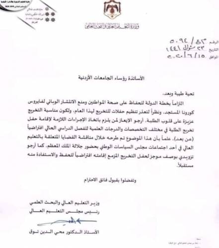 وأشار الكتاب إلى أن موضوع حفلات التخرج "تم طرحه خلال مناقشة القضايا المتعلقة بالتعليم العالي في أحد اجتماعات مجلس السياسات الوطني بحضور جلالة الملك عبدالله الثاني".