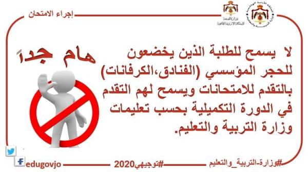 وأكدت الوزارة أنه لن يُسمح للطلبة الذين يخضعون للحجر المؤسسي (الفنادق، الكرفانات) بالتقدم للامتحانات، فيما سيُسمح لهم بذلك في الدورة التكميلية.