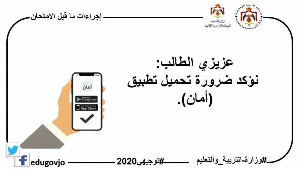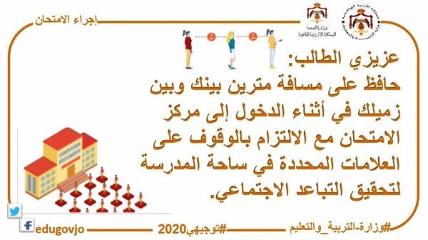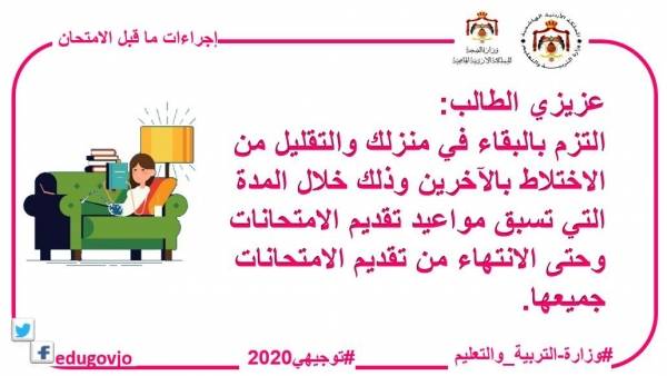 ودعت الوزارة الطلبة للالتزام بالبقاء في المنزل، والتقليل من الاختلاط بالآخرين، وذلك خلال المدة التي تسبق مواعيد تقديم الامتحانات وحتى الانتهاء من تقديم الامتحانات جميعا، كما دعت الطلبة ممن يملكون هواتف جوالة لتحميل تطبيق أمان عبر هواتفهم.