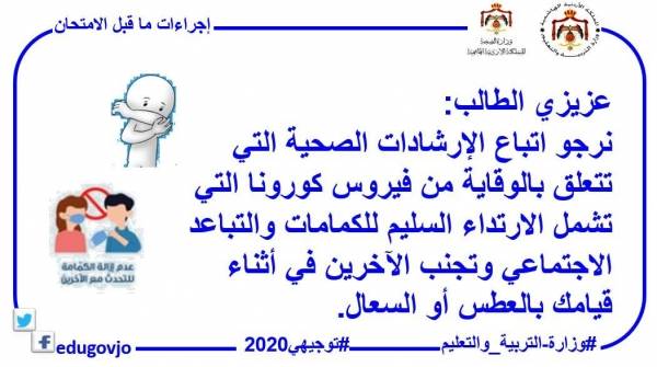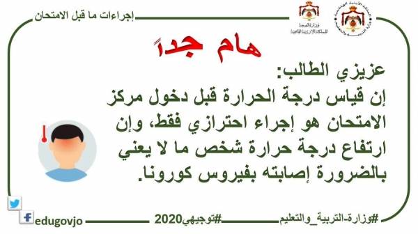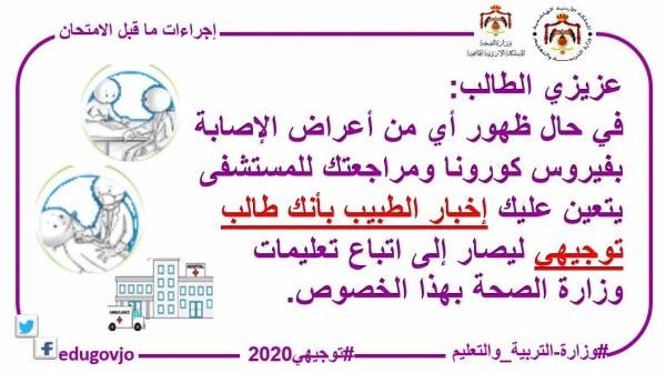 ودعت الوزارة الطلبة في حال ظهور أي من أعراض الاصابة بفيروس كورونا ومراجعة المستشفى لابلاغ الطبيب بأنه طالب ثانوية عامة، ليُصار إلى اتباع تعليمات وزارة الصحة بهذا الخصوص.