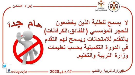ويشير البروتوكول الى انه لن يسمح للطلاب الذين يخضعون للحجر المؤسسي بالتقدم للامتحانات ، ولكن سيسمح لهم بالتقدم للدورة التكميلية.