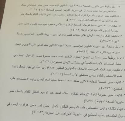 ومن ابرز التنقلات نقل مدير صحة اربد الدكتور قاسم مياس الى مجال اختصاصه وتكليف الدكتور رياض الشياب بدلا له.
