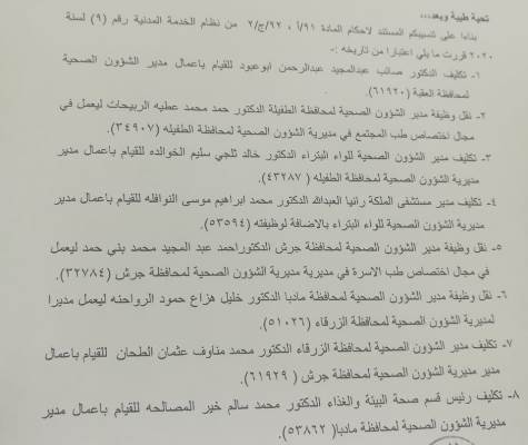 وكما ضمت تكليف الدكتور محمد الطحان للقيام بأعمال مدير صحة جرش، وتكليف مدير مستشفى الملكة رانيا محمد النوافلة للقيام بأعمال مدير صحة لواء البترا.