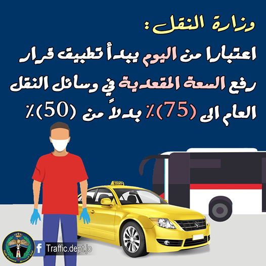 جفرا نيوز - ذكرت إدارة السير في مديرية الامن العام ، ببدء تطبيق قرار رفع السعة المقعدية في وسائل النقل العام الى (75)% بدلاً من (50)% اعتبارا من اليوم (الخميس).