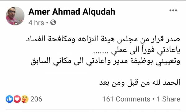هيئة النزاهة ومكافحة الفساد تصدر قراراً بإعادة الموظف عامر القضاة فوراً إلى عمله في محافظة الزرقاء