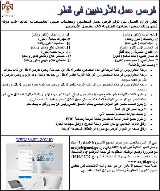 جفرا نيوز- أعلنت وزارة العمل عن توفر فرص وظيفية لمعلمين ومعلمات أردنيين في دولة قطر تنفيذاً للمبادرة القطرية لتشغيل الأردنيين في قطر .