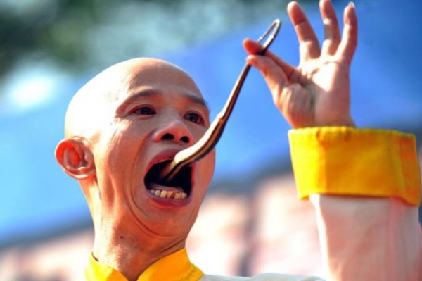 بالصور..رجل يقف على مسمار برأسه وآخر يبتلع ثعبانًا
