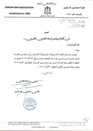 جفرا نيوز - حدد مجلس نقابة المحامين، اليوم الاثنين العطلة القضائية ابتداء من 1/8/2020 حتى نهاية دوام 31/8/2020 أمام جميع محاكم المملكة مع الالتزام بالمواعيد ومدد السقوط.