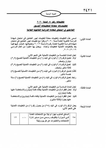 جفرا نيوز - صدر في عدد اليوم للجريدة الرسمية اليوم الأربعاء، التعليمات رقم 5 لسنة 2020، المعدلة لأجور العاملين في امتحان الثانوية العامة، ويعمل بها اعتباراً من العام الدراسي 2020/2019.