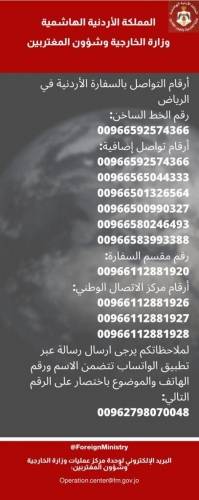 جفرا نيوز- أعلنت وزارة الخارجية وشؤون المغتربين الجمعة، عن تخصيص أرقام للتواصل مع السفارة الاردنية في الرياض.