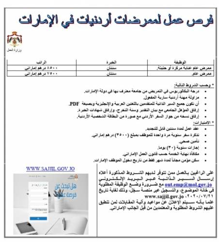 وتدعو الوزارة الراغبين بالعمل ممن تتوافر لديهم الشروط المذكورة إرسال السير الذاتية عبر البريد الإلكتروني out.emp@mol.gov.jo مع ضرورة وضع الوظيفة المطلوبة في خانة الموضوع، والتسجيل عبر منصة سجّل www.sajjil.gov.jo وذلك قبل تاريخ 21/07/2020.
