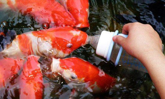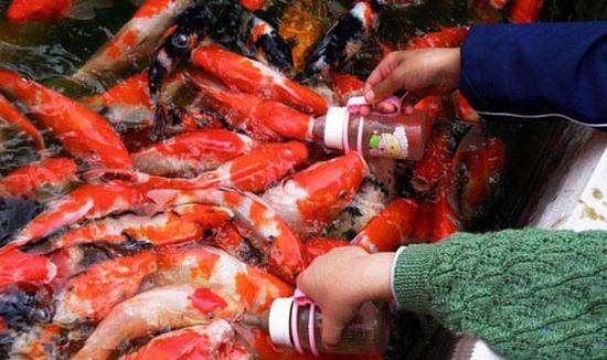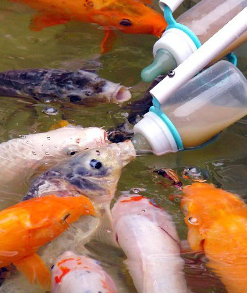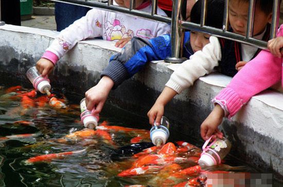 جفرا نيوز - جفرانيوز-في إحدى البرك التابعة لأحد لمعبد (Tanhua) في الصين تقع مجموعة من الأسماك من النوع (Koi) يميزها أنها تلقت تدريبا لسنوات على أن تتلقى غذائها بواسطة رضاعات الأطفال. بحيث يتم طحن وإذابة غذائها في رضاعات للأطفال ويتم إطعام السمك بواسطتها مباشرة.