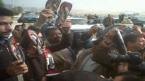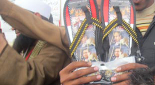 جفرا نيوز - جفرا نيوز-قام أهالي الشهداء والمصابين الذين حضروا أمام أكاديمية الشرطة مقر محاكمة مبارك ونجليه ووزير داخليته و6 من معاونيه برفع “شباشب” مكتوب عليها “فتحي سرور موافقات” و”مبارك” و”جمال مبارك” و”حبيب العادلي”, مطالبين هيئة المحكمة بإعدام مبارك ونجليه والعادلي.