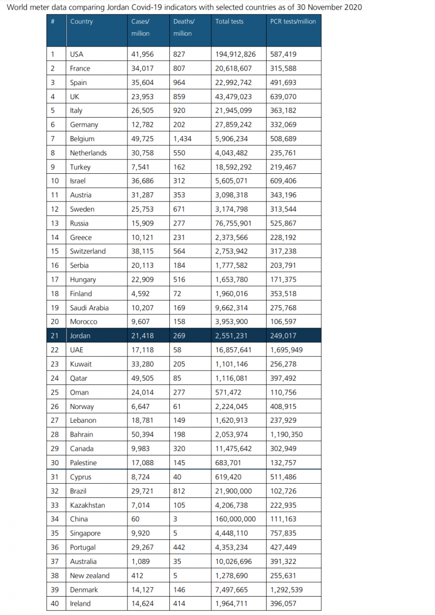 كما احتل الأردن المرتبة 19 بمؤشر معدل الوفيات لكل مليون من السكان، منذ بداية الجائحة.
