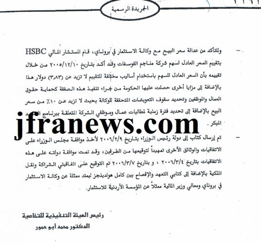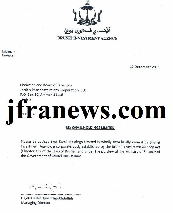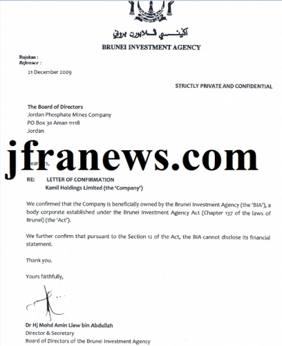 هذه المعلومات التي سننشرها موثقة تدحض كافة ادعاءات النائب احمد الشقران الذي لا يدرك هو ومن معه في لجنة التحقيق ان الشائعات والمعلومات المغلوطة التي تنشر على السنتهم تسبب اضررا كبيرة في قطاع الاستثمار في البلاد خاصة ان حكومة سلطنة بروناي اعلنت في الكثير من المحافل الدولية عن إمتعاضها الشديد لما يجري في الاردن ولما يروجه البعض حول شبهات الفساد في اتفاقية خصخصة شركة الفوسفات،وقد اكدت مصادر خاصة لـ"جفرانيوز"ان السلطنة قررت خفض استثماراتها في الاردن بنسبة كبيرة جدا يمكن ان ترقى الى المستوى الكارثي خاصة ان السلطنة لها العديد من الاستثمارات في الاردن.