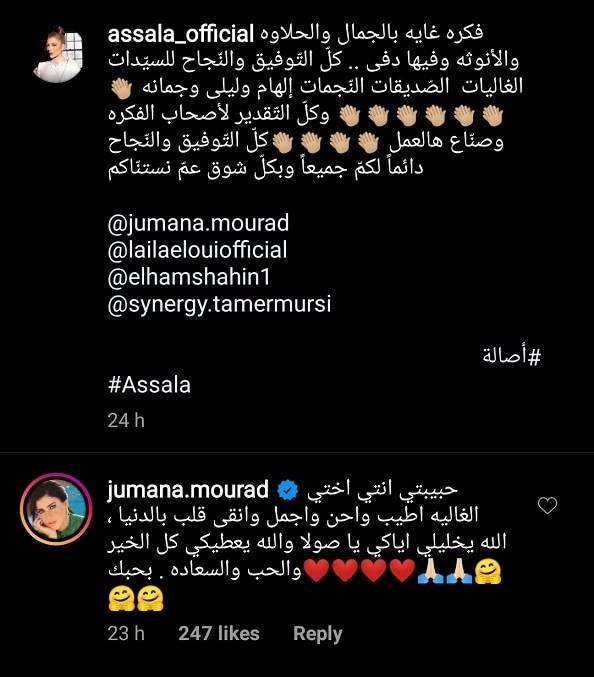 لتعود النجمة السورية جومانا مراد وترد على منشور أصالة تعبيرا عن حبها الكبير الذي تكنّه لها، ووصفتها" بأختي الغالية" متمنية لأصالة الخير والحب والسعادة، وعلقت" حبيبتي انتي أختي الغالية أطيب وأحن وأجمل وأنقى قلب بالدنيا".