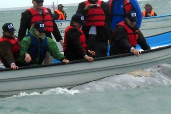 وأظهرت الصور التي نشرها موقع (تي إم زي) الأمريكي مواجهة كلينتون مع الحوت في لوس كابوس في المكسيك.