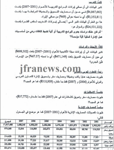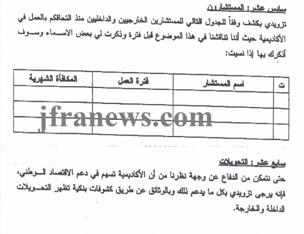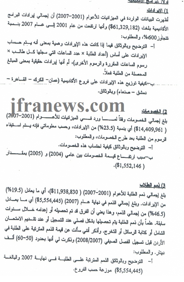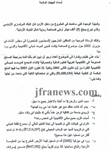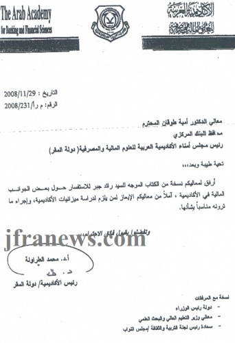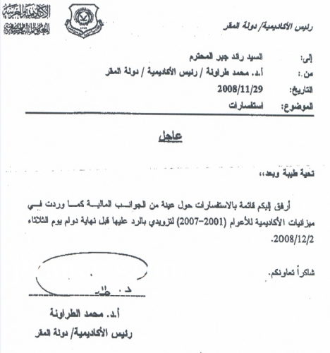ونضع في هذه الحلقة الوثائق الموجهه من قبل الاستاذ الدكتور محمد الطراونة / رئيس الاكاديمية / دوله المقر الى معالي الدكتور امية طوقان محافظ البنك المركزي السابق رئيس مجلس امناء الاكاديمية (دوله المقر ) / وزير المالية الحالي والذي يشير فيه الى كتابه الموجه للسيد رائد جبر / نائب رئيس الاكاديمية للشؤون الادارية والمالية الحالي حول بعض الجوانب المالية في الاكاديمية استنادا الى ميزانيات الاكاديمية .