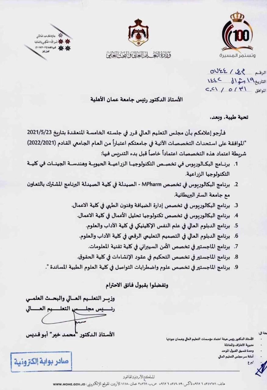 جفرا نيوز- مواكبة للتطورالعلمي والتكنولوجي ومواءمة بين البرامج الاكاديمية ومتطلبات سوق العمل ، وضمن الرؤية الاستراتيجية الثاقبة لجامعة عمان الأهلية ، وبجهود إدارتها ممثلة برئيس هيئة المديرين الدكتور ماهر الحوراني ورئيس الجامعة الاستاذ الدكتور ساري حمدان وعمداء الكليات ودائرة الإعتماد وأعضاء الهيئة التدريسية في مختلف التخصصات ... حصلت الجامعة على موافقة مجلس التعليم العالي على استحداث تسعة تخصصات نوعية لدرجات البكالوريوس والدبلوم العالي والماجستير ، حيث وافق مجلس التعليم العالي في جلسته الخامسة المنعقدة بتاريخ 23-5-2021 على استحداث هذه التخصصات اعتبارا من العام الجامعي 2021-2022 شريطة اعتماد هذه التخصصات اعتمادا خاصا قبل بدء التدريس فيها والتخصصات هي :