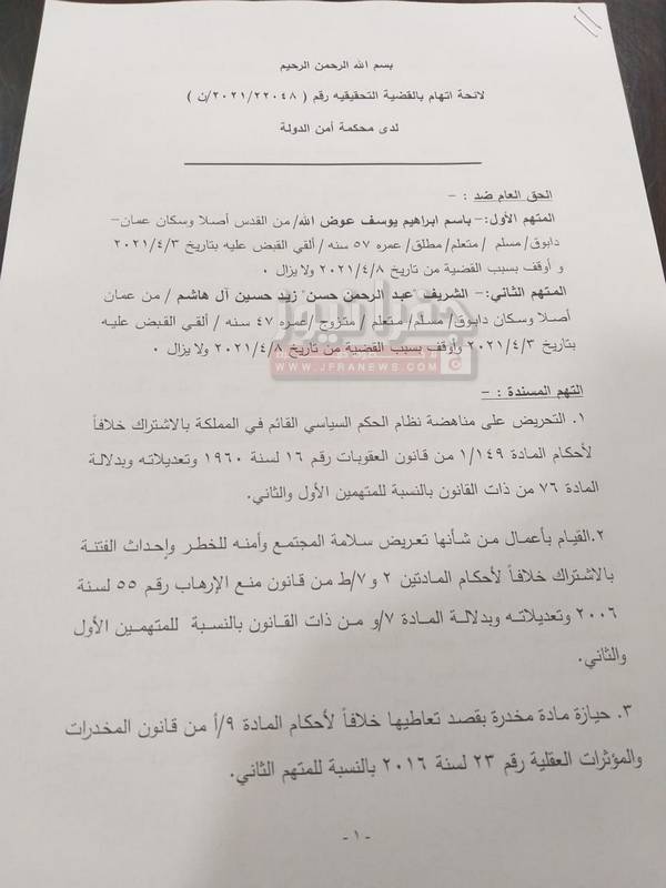 * القبض على باسم عوض الله 57 عاما وعلى الشريف حسن بن زيد 47 عاما , بتاريخ 3/4/2021 وتوقيفهما منذ 8/4/2021
