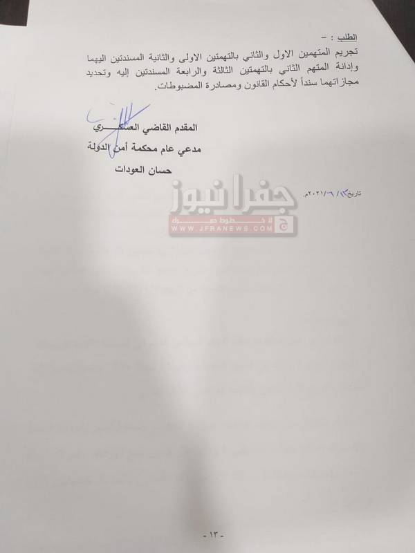جفرا نيوز - صادق النائب العام لمحكمة أمن الدولة العميد القاضي العسكري حازم عبدالسلام المجالي على قرار الظن الصادر عن مدعي عام محكمة أمن الدولة في القضية المتعلقة بالمشتكى عليهما كل من (باسم إبراهيم يوسف عوض الله) و(الشريف "عبدالرحمن حسن" زيد حسين)، والتي أسند فيها للمشتكى عليهما تهمتا جناية التحريض على مناهضة نظام الحكم السياسي القائم في المملكة بالاشتراك خلافاً لأحكام المادة 149/1 من قانون العقوبات رقم 16 لسنة 1960 وتعديلاته وبدلالة المادة 76 من ذات القانون