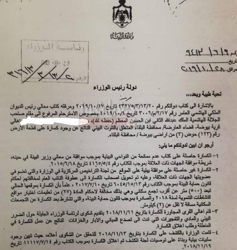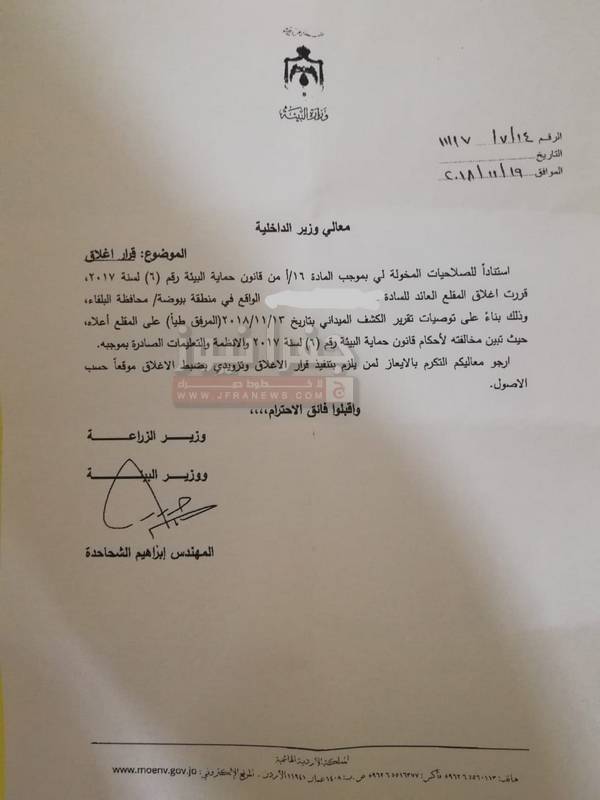 وزير البيئة السابق ابراهيم الشحاحدة خاطب وزير الداخلية منذ العام 2018 بالايعاز لمن يلزم باغلاق المقلع فورا لمخالفته قانون البيئة , وكذلك اعلم رئيس الوزراء بذلك القرار , الا ان لا اجراء تم كن وزارة الداخلية ولا متابعة تمت من رئاسة الوزراء ..