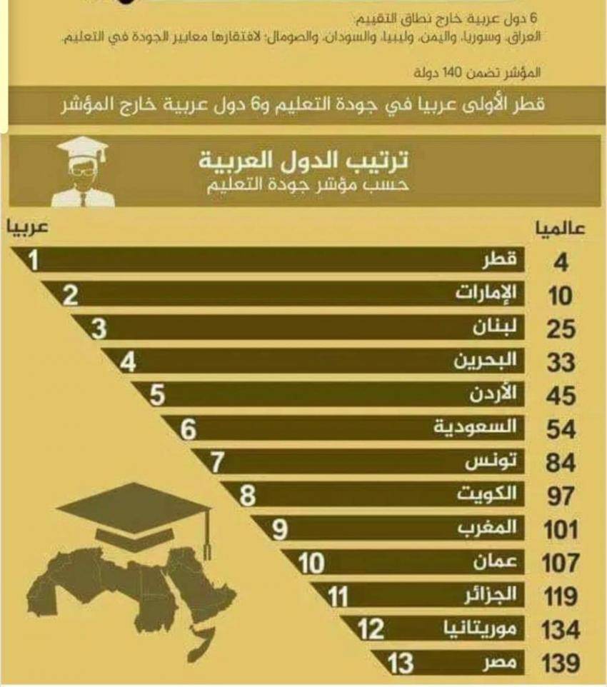 بينما احتلت مصر المرتبة الأخيرة عربيا، والمرتبة 139 عالميا، من أصل 140 دولة تضمنها مؤشر دافوس لجودة التعليم.